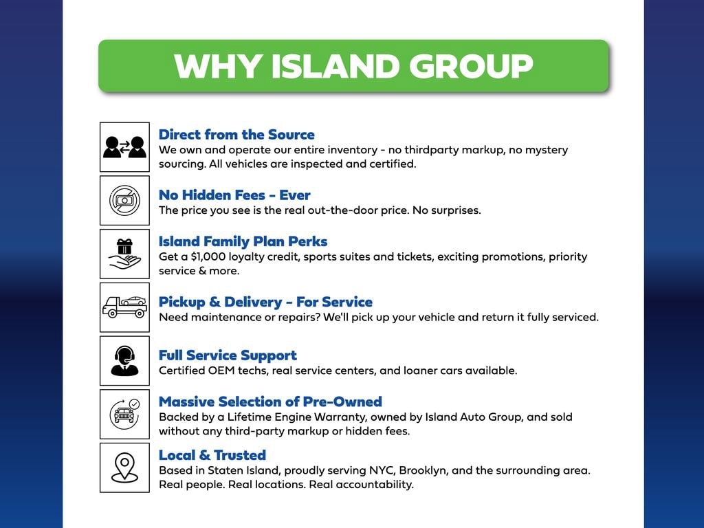 Island Auto Group No Hidden Fees, No Games, Just Real Prices! What You See is What You Pay No "Extra" Dealer Fees Ever! Most dealers advertise fake prices with hidden fees ours are real! Direct Dealer Pricing No Middlemen, No Markups Lifetime Engine Warranty on Pre-Owned Vehicles Exclusive Island Family Rewards Earn Points, Get Perks Priority Service & Loaner Cars for Island Customers Visit IslandAutoGroup.com or watch our videos to see why buying with Island is the best choice for your family!