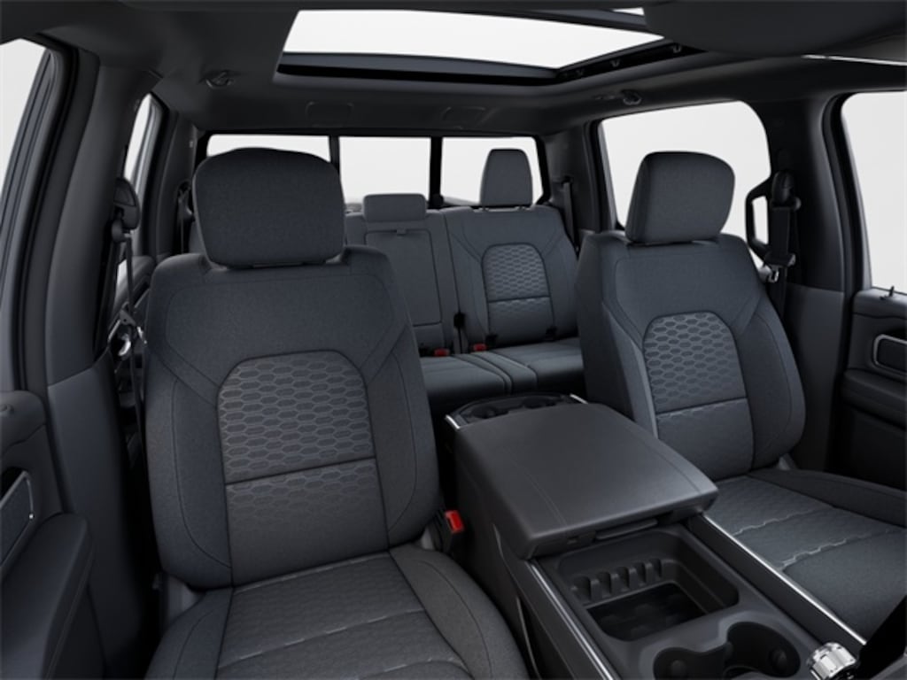 115V Auxiliary Power Outlet, 115V Auxiliary Rear Power Outlet, 12" Touchscreen Display, 2nd Row in Floor Storage Bins, 3 Rear Seat Head Restraints, 4 Way Front Headrests, 400W Inverter, 4G LTE Wi-Fi Hot Spot, 9 Amplified Speakers with Subwoofer, Accent Color Door Handles, Accent Color Premium Power Mirrors, Accent Color Tailgate Handle, Air Conditioning ATC with Dual Zone Control, Anti-Spin Differential Rear Axle, Apple CarPlay, Auto Power-Folding Mirrors, Auto-Dimming Exterior Driver Mirror, Auto-Dimming Rear-View Mirror, Bed Utility Group, Big Horn Level 2 Equipment Group, Black Exterior Mirrors, Black Exterior Truck Badging, Black Headlamp Bezels, Black Interior Accents, Black Painted Exterior Mirrors Caps, Black Premium Power Mirrors, Black Tail Lamp Bezels, Black Trailer Tow Power Mirrors, Body Color Fender Flares, Body Color Front Bumper, Body Color Rear Bumper with Step Pads, Bucket Seats, Center Console Parts Module, Cluster 7.0" TFT Color Display, Configurable Drive Mode, Connected Travel and Traffic Services, Connectivity - US/Canada, Convex Wide-Angle Exterior Mirror Insert, Deluxe Cloth Bucket Seats, Disassociated Touchscreen Display, Dual Exhaust with Black Tips, Exterior 115V AC Outlet, Exterior Mirrors Courtesy Lamps, Exterior Mirrors with Heating Element, Exterior Mirrors with Supplemental Signals, Front Seat Back Map Pockets, Full Length Floor Console, Global Telematics Box Module, Glove Box Lamp, Google Android Auto, GPS Antenna Input, GPS Navigation, Grille Black Surround Black Mesh, HD Radio, Heated Front Seats, Heated Steering Wheel, Integrated Center Stack Radio, Integrated Voice Command with Bluetooth, Leather Wrapped Steering Wheel, LED Dome Lamp with on/Off Switch, LED Footwell Lighting, Manual Adjust 4-Way Front Passenger Seat, Manual Folding Exterior Mirrors, Manual Telescoping Mirrors, Media Hub with 2 Charge Only USBs, Mirror Clearance/Running Lights, MOPAR 4 Adjustable Cargo Tie-Down Hooks, MOPAR Spray in Bedliner, Night Edition, Overhead LED Lamps, Pick-Up Box Lighting, Power 2-Way Driver Lumbar Adjust, Power Adjust 8-Way Driver Seat, Power Adjustable Pedals, Power-Adjustable Convex Aux Mirrors, Premium Overhead Console, Quick Order Package 21Z Big Horn, Radio: Uconnect 5 Navigation with 12.0" Display, RAM Grille Badge - Black, Rear 60/40 Folding Seat, Rear Center Armrest, Rear Power Sliding Window, Rear Window Defroster, Remote Tailgate Release, Security Alarm, SiriusXM Radio Service, SiriusXM with 360L, Steering Wheel Mounted Audio Controls, Sun Visors with Illuminated Vanity Mirrors, Towing Technology Group, Trailer Brake Control, Trailer Hitch Line-Up Assist, Trailer Reverse Steering Control, Trailer Tire Pressure Monitoring System, Trailer Tow Group, Trailer Tow Mirrors, Universal Garage Door Opener, USB Host Flip, Wheels: 20" x 9.0" Aluminum Painted Clad, Wheels: 20" x 9" Aluminum Chrome Clad.