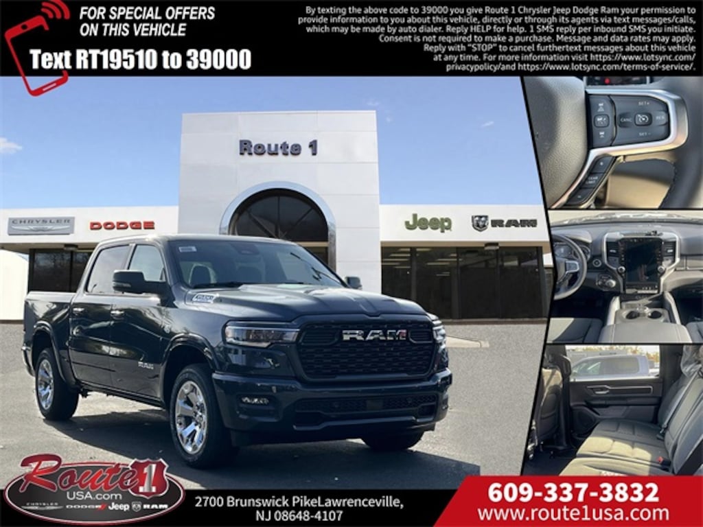 115V Auxiliary Power Outlet, 115V Auxiliary Rear Power Outlet, 12" Touchscreen Display, 2nd Row In Floor Storage Bins, 3 Rear Seat Head Restraints, 4 Way Front Headrests, 400W Inverter, 4G LTE Wi-Fi Hot Spot, 9 Amplified Speakers w/Subwoofer, Accent Color Tailgate Handle, Air Conditioning ATC w/Dual Zone Control, Apple CarPlay, Auto Power-Folding Mirrors, Auto-Dimming Exterior Driver Mirror, Auto-Dimming Rear-View Mirror, Bed Utility Group, Big Horn Level 2 Equipment Group, Black Exterior Mirrors, Black Interior Accents, Black Premium Power Mirrors, Body Color Door Handles, Body Color Fender Flares, Body Color Front Bumper, Body Color Rear Bumper w/Step Pads, Body Color Tailgate Handle, Bucket Seats, Center Console Parts Module, Cluster 7.0" TFT Color Display, Configurable Drive Mode, Connected Travel & Traffic Services, Connectivity - US/Canada, Convex Wide-Angle Exterior Mirror Insert, Deluxe Cloth Bucket Seats, Disassociated Touchscreen Display, Dome Dual LED Reading Lamp, Dual-Pane Panoramic Sunroof, Exterior 115V AC Outlet, Exterior Mirrors Courtesy Lamps, Exterior Mirrors w/Heating Element, Exterior Mirrors w/Supplemental Signals, Front Seat Back Map Pockets, Full Length Floor Console, G/T Exhaust, Global Telematics Box Module (TBM), Glove Box Lamp, Google Android Auto, GPS Antenna Input, GPS Navigation, Grille Surround 1 Body Color Texture 1 Black, HD Radio, Heated Front Seats, Heated Steering Wheel, Integrated Center Stack Radio, Integrated Voice Command w/Bluetooth, Leather Wrapped Steering Wheel, LED Dome Lamp w/On/Off Switch, LED Footwell Lighting, Manual Adjust 4-Way Front Passenger Seat, Media Hub w/2 Charge Only USBs, MOPAR 4 Adjustable Cargo Tie-Down Hooks, MOPAR Spray In Bedliner, Multi-Function Tailgate, Overhead LED Lamps, Pick-Up Box Lighting, Power 2-Way Driver Lumbar Adjust, Power Adjust 8-Way Driver Seat, Power Adjustable Pedals, Premium Overhead Console, Quick Order Package 27Z Big Horn, Radio: Uconnect 5 Nav w/12.0" Display, RAM Grille Badge - Chrome, RAM's Head Badge, Rear 60/40 Folding Seat, Rear Center Armrest, Rear Power Sliding Window, Rear Window Defroster, Remote Tailgate Release, Security Alarm, SiriusXM Radio Service, SiriusXM w/360L, Sport Appearance Package, Steering Wheel Mounted Audio Controls, Sun Visors w/Illuminated Vanity Mirrors, Universal Garage Door Opener, USB Host Flip, Wheels: 20" x 9" Aluminum Chrome Clad (WRK).